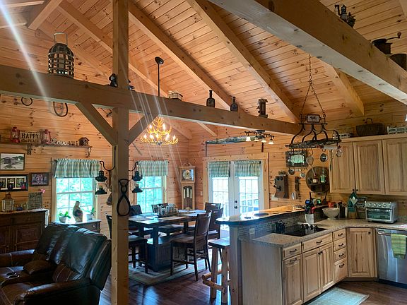 This amazing log home features geothermal heating & cooling, white pine tongue and groove ceilings, hand-scraped wood floors, natural maple countertops, SS Appliances, Pella windows, 1st floor laundry, 32X12 deck, covered front porch, and a gorgeous lake view. Some custom wood furniture is included. 3 car detached garage measures 30x40 with 1 oversized bay for Boat/RV storage, electric and garage door openers. Electric hook-up for camper/RV also. 2 additional storage sheds.