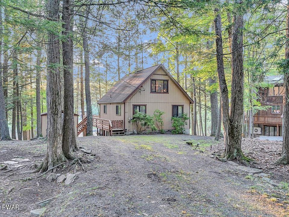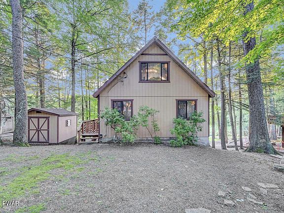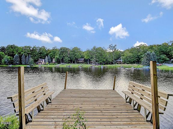 Beaver Lake Lakefront chalet in the amenity filled community of Wallenpaupack Lake Estates. This charming home features 2 bedrooms, 1 1/2 baths and a spacious loft. The first floor opens to the kitchen and living room with cathedral ceiling & beautiful stone wood burning fireplace. The finished walk out lower-level has tongue and groove walls & a pellet stove creating a cozy ambiance. Step outside onto the expansive wrap-around deck, where stunning lake views await. With your very own private boat dock, water adventures are just steps away. Embrace the tranquility and indulge in lakeside living at its finest. Central water & sewer. Amenities include: lake rights to Lake Wallenpaupack, beaches, indoor & outdoor pools, clubhouse, basketball/tennis & volleyball courts & more., Beds Description: 2+Bed1st, Baths: 1 Bath Level 1, Baths: 1/2 Bath Lev L, Sewer: WS Comm Central