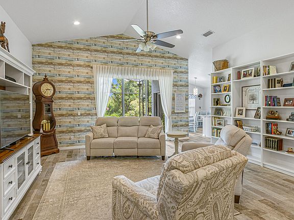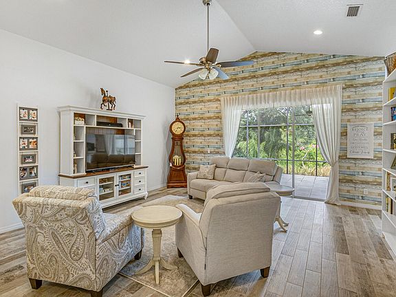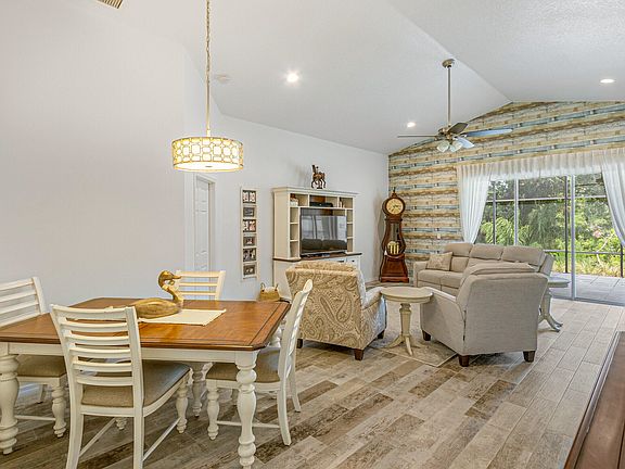 This beautifully remodeled home in Sandy Pines backs onto the serene Turkey Creek Preserve. Pride of ownership is evident in this fully renovated property, with over $95,000 spent on upgrades in recent years (ask for the upgrade list). The bright open floor plan features cathedral ceilings and updated wood-look tile plank flooring. The split floor plan ensures privacy. The spacious master suite includes his and her closets, a garden tub, a walk-in shower, and dual sinks with a vanity. The updated kitchen includes a gas stove, stainless steel appliances, and a breakfast nook overlooking the preserve. Sliding doors lead to an oversized screened porch, ideal for enjoying the yard. The gated community offers a community pool, clubhouse, and RV storage for added convenience and security.