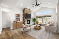 Striking stone fireplaceProfessional landscapingBreathtaking dells viewsExpanded primary bedroom closetHunter douglas blindsHoned quartz countertopsElegant floor-to-ceiling kitchen cabinets