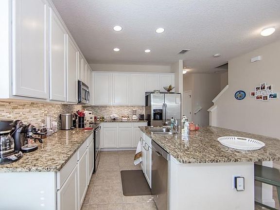 This 2014 elegant TOWNHOME by K. HOVNANIAN, located at an unique LAKE FRONT CORNER LOT, in the privileged and desirable community *** Lake Burden at the Lakes of Windermere ***. Welcome in and be amazed by this spacious 1881 heated sqft + detached garage + brick paved corner lot back yard. This 3 bed 2/1 bath home filled with natural light was completely customized with an extra downstairs bedroom and bathroom. On the right side of the foyer is the private BEDROOM with the BATHROOM right across. With 16" beige TILE FLOORING throughout the ground floor, the custom open kitchen, dinning and family room area is perfect for a family meeting. White 40" cabinets with unique backsplash, stainless steel appliances, huge island with 4 stools and granite countertops makes this FULLY FURNISHED HOME a one of a kind in the area. Conveniently located, the LAUNDRY is upstairs. The spacious 2nd and 3rd BEDROOMS are served by the a double sink BATHROOM on the second level of the home along with the MASTER BEDROOM. The backyard offers the privacy you need with NO REAR NEIGHBORS so you can relax and have fun at your pleasure. The COMMUNITY AMENITIES include clubhouse, pool, walking trails, tennis courts, a playground, picnic area, softball field, and a fishing dock.
