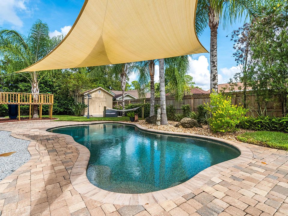 This Beautiful Move-in Ready Tradional Brick 5 bedroom /2.5 bathroom home is situated perfectly in the Heart of Mandarin! In the Ramsgate Community, this lovely home features Very spacious Kitchen with Custom Cabinetry, with built in Pantry, Stainless Steel appliances, triple edge Stone Composite counter top. A Breakfast bar/Island and porcelian tile. Hardwood floors, carpet, and new paint in certain rooms. All windows replaced with insulated windows. In addition to all the upgrades this home has to offer, a 16x17 Florida Room that is attached to home was added in 2013, with porcelain tiles, screened in , overlooking the in-ground pool and a Stunning Stone Waterfall. A Storage/Shed in the fully fenced private Backyard is also included