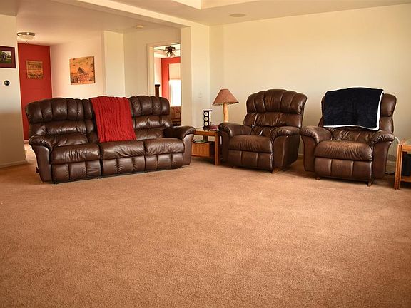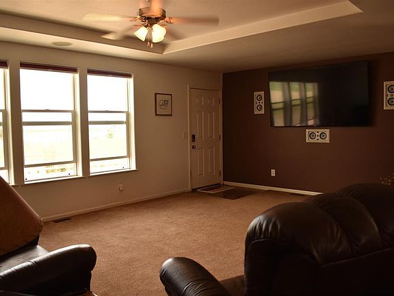 360 degree views on 5.59 acres. This property boasts of a super sized 2464 square foot garage. Insulated, finished and heated for vehicles and plenty of room for projects. Two separate heated rooms with custom cabinets, set off to the side of the garage. A 4 bedroom, 3 bath, house with surround sound setup in the living room compliments the garage. A door from the master suite leads outside to a private patio or hot tub space. The front lawn has a sprinkler system and landscaping. Wrap around sidewalks make this home easy to keep the yard space nice and tracking dirt into the house to a minimum. Domestic well allows for animals and outside watering up to an acre. Sellers are finishing the brick fencing with medal gates for future buyers. On demand water heater and included kitchen appliances provides a move in ready home. Sellers will considering buying down the interest rate. Call for more details. A must see. Call today!