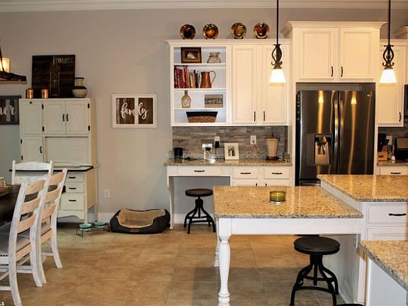 4 bedroom 3 bath open floor design. Fabulous kitchen with huge island, extra table space, tons of cabinets, good size pantry, and gas stove. Also, has a large breakfast area and built in desk and shelves. This home has a large master suite with trey ceilings, double sinks in bathroom, soaking tub, tiled shower, and large walk-in closet. The second bathroom also has large vanity with 2 sinks and separate shower area. The great room is large with a gas fireplace, built in book shelves, and separate dining area. The outside has a very large partially covered paver patio, 30 year shingles, full house gutters, fence, and firepit area. This home also has a tankless hot water heater. IT IS GOLD FORTIFIED and comes with hurricane shutters. Neighborhood offers a pool, and a stocked lake with fishing pier and gazebo. Seller is a licensed real estate agent in the State of Alabama.
