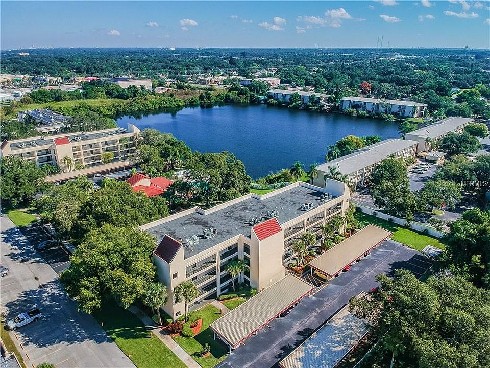 Here's a super opportunity to enjoy life in the peaceful beautiful lakefront community of Water's Edge. This large 2BR 2BA penthouse floor condo with split bedroom floorplan has an excellent serene location. A spacious great/living room includes a dining area and sliding glass doors to the lanai. The generously sized master suite has large walk-in closet, room for king size bed and extra furniture. The master bathroom has long vanity, linen closet and sliding doors to the lanai. The second bedroom is spacious and secondary bath has walk-in shower. Kitchen has a breakfast bar plus eat-in nook with South facing window letting in extra light. The inside washer and dryer is included. Your large screened & glass enclosed lanai gives lovely views of oak trees and landscaped grounds - the lakefront large heated pool & spa are within sight and the resort style clubhouse is a must see. The clubhouse offers gathering space plus tables for dining, events, games. Water's Edge is convenient to the Gulf Beaches, restaurants, grocery stores, malls, hospitals, rehab, Rx, parks, Pinellas Trail, golf, tennis, gyms and more! Look no further if you want a well maintained building, accessible wide doorways, low HOA fees, pet free, non-smoking and 55+ community.