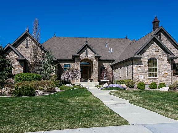 Sophisticated & luxurious Highland estate home on huge lot with resort-like landscaping, heated pool and sprawling outside entertaining space for 100+ friends. Gorgeous exterior featuring natural stone, hand-made brick & copper cupolas and finials on roof give this house amazing curb appeal. Impeccably finished interior with soaring ceilings, custom finish work throughout, gourmet chef kitchen with granite countertops & Monogram stainless appliances, and adjoining dining room that seats 14. Massive master suite on main level includes fireplace, jetted tub and spa shower, and giant closet with custom shelving. Main level also includes second large bedroom with ensuite bathroom – perfect for house guests. Get your creativity flowing with the magnificent craft room on the main level that features floor to ceiling custom cabinetry, granite counters and built-in computer and sewing machine desks. Full walkout basement features game room, kitchen and custom theater room where you can enjoy your favorite movies in 7.1 surround sound and on the 135" widescreen. The backyard is like being at a Four Seasons resort; imagine parties with friends and family in the gigantic 40 x 20 heated salt water pool & in-ground hot tub, barbequing on the built-in grill in the outside kitchen or roasting marshmallows on the gas fire pit – all against the soothing backdrop of the backyard waterfall. The custom play set, basketball court and in-ground trampoline keep kids busy for hours and the full outside pool bathroom featuring dual shower heads keeps the party outside. Cleaning up all the pool toys is a breeze with the large outside pool storage room. Control 4 whole-home audio & video distribution throughout; extensive storage with custom-built shelving, alarm system, 2 laundry rooms, 3 HVAC systems, and a 4 car garage complete this masterfully designed executive residence.