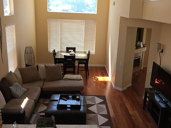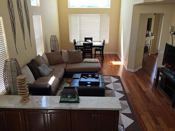 2,382 square feet, 5 bedrooms, 3 full bathrooms, and 3 car garage. The downstairs bedroom can be used as an office. It has built-in bookshelves and file cabinets. Ceiling fans and crown molding throughout all the bedrooms. Nicely upgraded kitchen with Cocoa Maple Raised Panel Cabinets, Bianco Romano granite counter-tops and Stainless Steel appliances. Brazilian Cherry hardwood floors in pristine condition. Located on a quiet cul de sac street with a private backyard backing up to a canyon. Walking distance to the top-ranking Creekside Elementary school of the coveted Poway Unified School District and South Creek Community Park. Easy access to I-15 Fwy and CA-56. A short drive to Carmel Mountain/Poway/Scripps Ranch and Mira Mesa shopping areas. Washer and Electric Dryer Hookups, but does not include a washer and dryer. NO PETS! $4680/month for a one-year lease term. Good credit is required. Application fee: $40 per adult. The approximate Move-in date is July 1st.