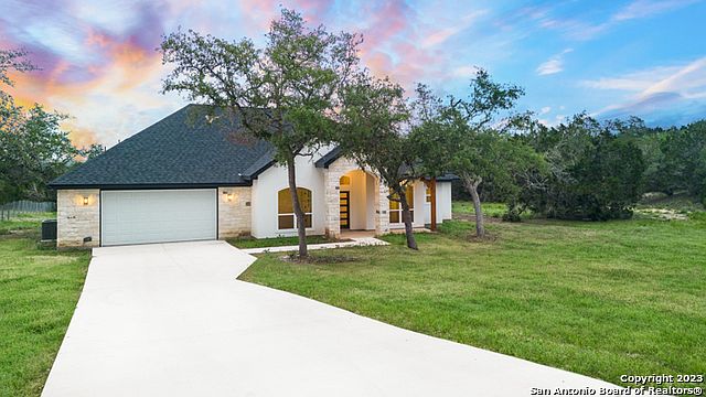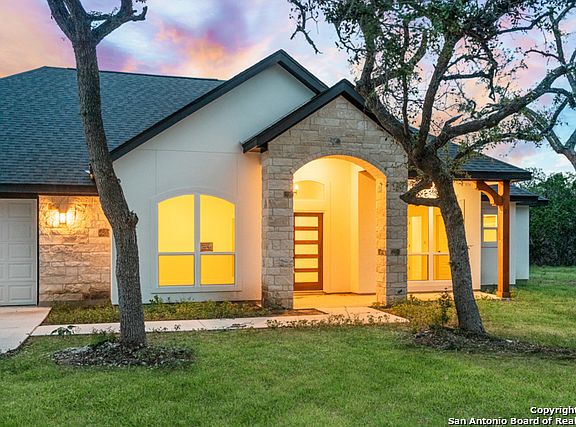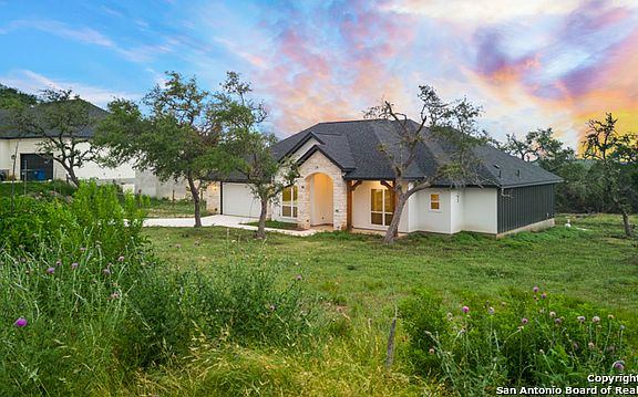Welcome to your dream retreat in the picturesque hill country! This one-story home, just minutes from Canyon Lake, offers modern features and a spacious, open floor plan perfect for entertaining and creating cherished memories with loved ones. With 3 bedrooms, 2.5 bathrooms, and an elegant design, this home caters to relaxation and functionality. The kitchen is beautifully equipped, and the property sits on a generous 1.12-acre lot with mature trees for shade and privacy. It even includes an office space and thoughtful touches like no carpet for easy maintenance. This stunning hill country home blends modern finishes with natural beauty. Don't miss this opportunity to make it your forever home! (DISCLAIMER: The grass has been photoshopped to enhance the photos.)