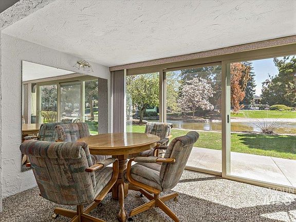Hidden gem condo in the heart of Boise! Chateau Les Bois was conceived as a resort-like oasis in the city, developed in the late mid-century as a first of its kind community. With nearly twelve acres of grounds featuring five ponds, fountains, walking paths and bridges, pool and clubhouse, this glorious park-like setting is like no other. This unit is on the ground floor with an east-facing patio perfectly positioned to maximize views and offering simple, no-maintenance living with no stairs. The open floorplan flows from the efficient kitchen to living spaces to the sunny sunroom and patio. The well-designed space includes a cozy fireplace, storage and an abundance of cabinets to maximize efficiency. Covered carport parking includes two outdoor storage units.   Peace, beauty and ease are offered here.