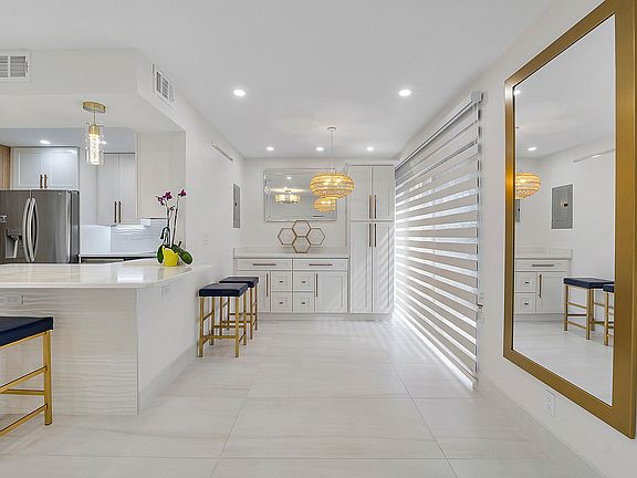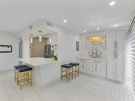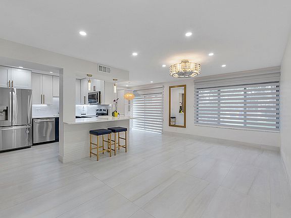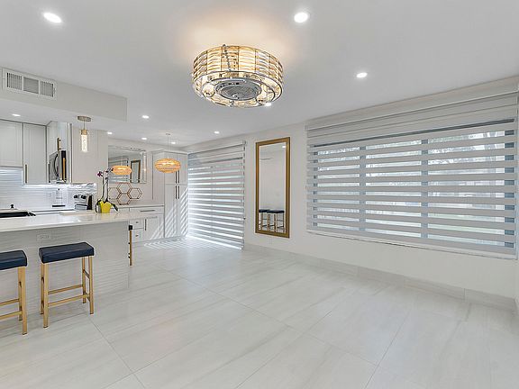 Step into opulence, recently renovated two -story luxury townhome nestled in the center of Boca Raton! This 3-bedroom residence embodies sophistication. Completely renovated including electrical, plumbing, drywall, and panel box with permits. Gorgeous 24-inch X 48- inch porcelain tile on the first floor with highly upgraded light fixtures and fans throughout.Indulge your culinary desires in the gourmet kitchen equipped with stainless appliances, quartz counters tops and backsplash. The open design is perfect for entertaining. The home is adorned with zebra sheer pull up shades over hurricane resistant windows and doors throughout. The primary suite is located on the first floor and both luxury baths have Toto toilets, LED dimmable vanity mirrors, gorgeous tile, fixtures & vanities. The second-floor bedrooms are spacious and there is added storage area and an attic that has energy efficient foam insulation.