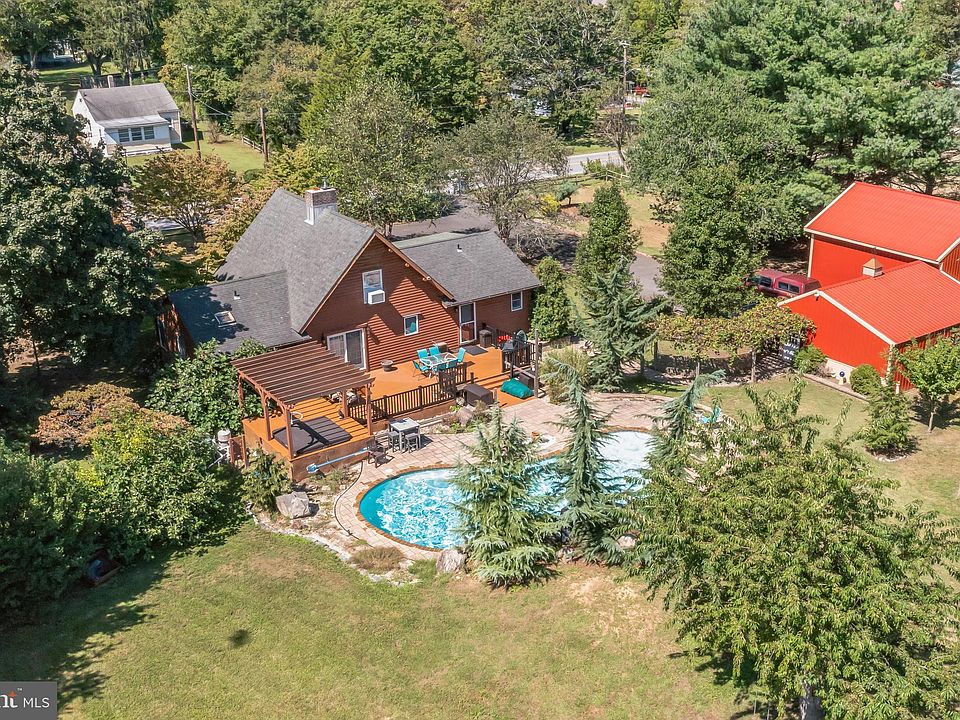 Welcome to your dream log cabin home nestled on a private 1.26-acre lot, offering the perfect blend of rustic charm and modern comfort. Located in a serene and picturesque setting, this property boasts a wealth of amenities and features that promise a modern country lifestyle for you and your family. The home features a covered front porch with exceptional landscaping and hardscaping throughout the yard that complements the natural beauty of the surroundings. Step inside to discover an inviting open floor plan, where the warmth of the log cabin design bathed with natural light showcases the breathtaking surroundings. The two-story cathedral ceilings, adorned with elegant ceiling fans, create an airy and inviting atmosphere. The heart of this home is undoubtedly the eat-in kitchen, where you can create culinary delights while staying connected with family and friends. Beautiful hardwood flooring runs throughout, enhancing the cabin's cozy ambiance. Retreat to the generously sized bedrooms, where comfort and tranquility await. The main-level laundry room adds practicality to your daily routine. Continue to the second floor to discover a loft with a skylight, offering endless possibilities. It could serve as a third bedroom, an office, or a creative space to suit your needs. The primary bedroom is your private sanctuary, complete with a large walk-in closet and an attached full bathroom, ensuring your comfort and convenience. The basement is a haven for relaxation and entertainment, featuring ceramic tile flooring, a cozy fireplace, a wet bar, and a den that could easily become a fourth bedroom. It even has roughed-in plumbing for a half bath, offering the potential for even more convenience. Other exceptional amenities include a central vacuum system, 200 amp electrical service, natural gas hot water baseboard heat with summer/winter hookup, public sewer and a shed for additional storage. Enter your backyard oasis as you walk onto the 17x30 maintenance-free deck, complete with a hot tub and scenic views of the heated kidney-shaped in-ground pool with a captivating rock water feature. The fenced split rail yard provides privacy and safety. This home features a 24x24 outbuilding with electricity and a concrete floor, coupled with the attached two-car garage featuring insulated doors, which offers ample space for hobbies, storage, or a workshop. This property offers easy accessibility to Routes 47 and 55, making trips to Philadelphia and the Jersey Shore a breeze. Don't miss the opportunity to make this log cabin retreat your own, where every day feels like a vacation.