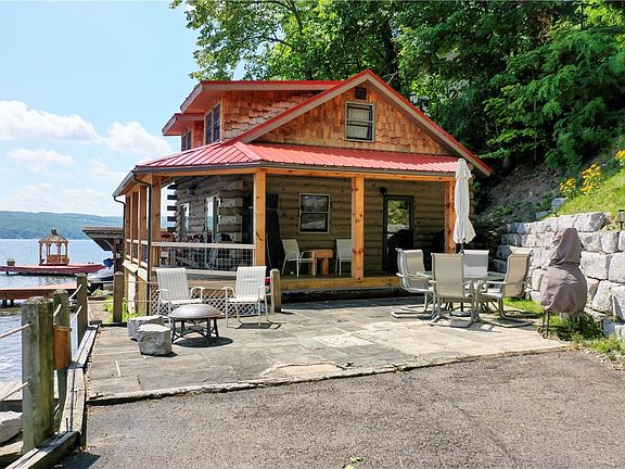 Don't miss this gorgeous west side log home w/110' of lakefront and one of a kind Keuka Lake views! Renovations/upgrades include: beautiful new kitchen and Cortec flooring with stainless steel island; new expanded, covered wraparound porch; new retaining wall along the blacktop driveway to the house w/parking for 5 cars. Very well done, and so cute! The 3 bed, 1 bath house features a 1st floor bedroom opening to the deck and lake. Property is completed with plentiful patio space and large permanent dock for ample gatherings. Located in a private cove w/breathtaking lake and bluff views. Great potential for a 2nd home or investment property. Near restaurants, wineries, breweries, distilleries & Hammondsport. Most furnishings are included aside from personal items & the Adirondack chairs. Delayed negotiations to August 16, 2023 at 3 pm.