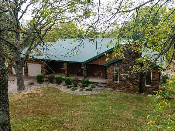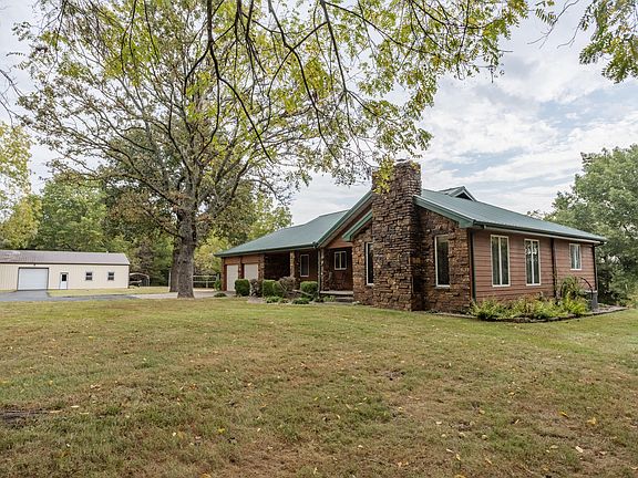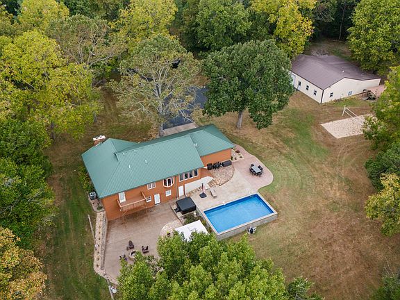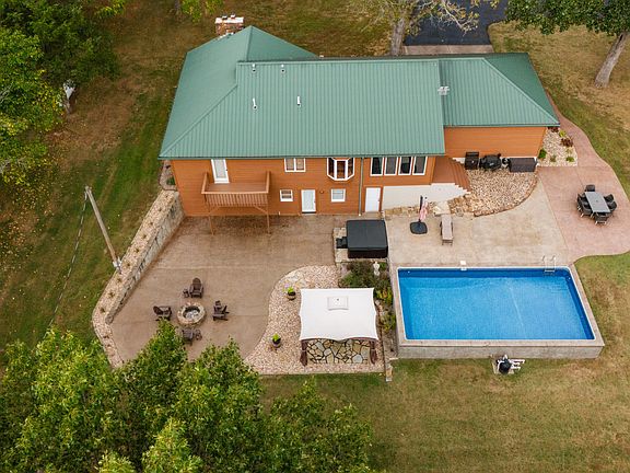 Discover your own private retreat! Located at the end of road nestled in the midst of Evergreens,Walnut trees and Oak trees. Serenity at its finest having abundance of wildlife. From you dining windows alone you will enjoy watching deer , squirrels, turkeys along with view of property scenery including gorgeous pool and patio area, plus stocked pond. Impressive as you pull up with scenic setting combined having cedar and stone front of home with covered front porch. Just to touch on a few things before getting to the home you have car enthusiasts 34 x50 dream shop having paint room, central heat and 20 x 50 cover lean too behind for more car or equipment space. More items include nice pool, large 2 level patio with lower section having cloth covered gazebo and burn pit area also a sand volleyball court located next to shop. Gun range area located by pond. Entering home you see right away the quality of this walkout basement home. Home well insulated and having 2x6 wall construction. Beautiful living room with wood burning stove having stone wall mantle area. Just stunning U shaped kitchen with lots of cabinet space having pull outs , concrete countertops, beautiful copper sink and copper accent piece above stove vent. You will love all the windows off kitchen and dining area exposing all the unique views that come with. Upstairs layout has living room with wood stove, main bedroom, laundry room/office space full bath having jetted tub and tiled walk in shower, kitchen, large dining area and island with seating,Downstairs walkout basement area has spacious living space great kitchen/bar area with bar seating sink and fridge 2 bedrooms full bath plus lots of storage. Area in home off patio has storage room for pool equipment and more plus has space great for hiding from any possible storms. Take enjoying your summer cook outs and morning coffee to the next level here! Buyer to due their own due diligence on sq footage.