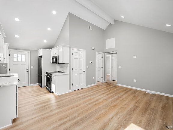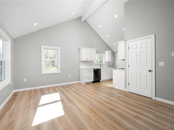 Beautiful two bedroom, one bath ranch set on a mature 1-acre lot within the Clarence school district. Located just 5 minutes from Clarence Hollow and multiple golf courses, this home offers both seclusion and convenience. Step inside to the meticulously renovated interior, featuring new luxury vinyl plank flooring, solid wood cabinetry, and quartz countertops. The light-filled living room boasts lofted ceilings and laundry is conveniently located on the first floor. Outside you can enjoy the serene surroundings of the wooded lot from your patio, or go for a walk on the Clarence Pathways which borders the southern portion of the property. Practical updates abound: new tear off roof with spray foam insulation, new electrical wiring and plumbing throughout, new vinyl siding, and new energy-efficient windows. Brand new stainless steel kitchen appliances, hot water tank, furnace and air conditioner. Freshly poured double driveway and slab in the two-car garage. Don’t miss the opportunity to make this charming, turn-key home your own!
