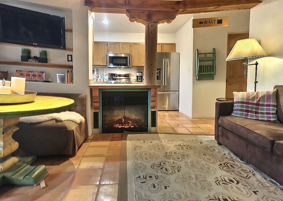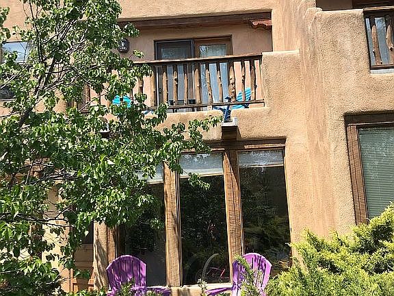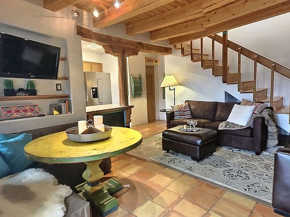 Delightful 2-BR/1.5 BA condo 3 blocks from Taos Plaza. Short walk to galleries, restaurants, shops, museums. Classic Taos southwestern style. In-floor radiant heat + good passive solar heating. Downstairs has ample kitchen, open to living room, plus half-bath. Upstairs has both bedrooms (one with balcony), full bath, access to pleasant private patio. Established 7-unit condo association with laundry facility, nicely landscaped grounds. This property would make a great vacation home or rental!