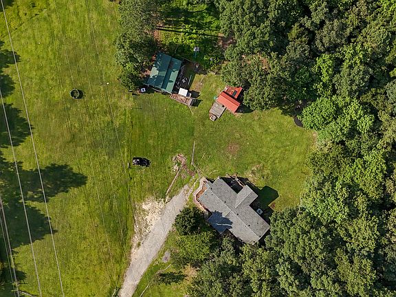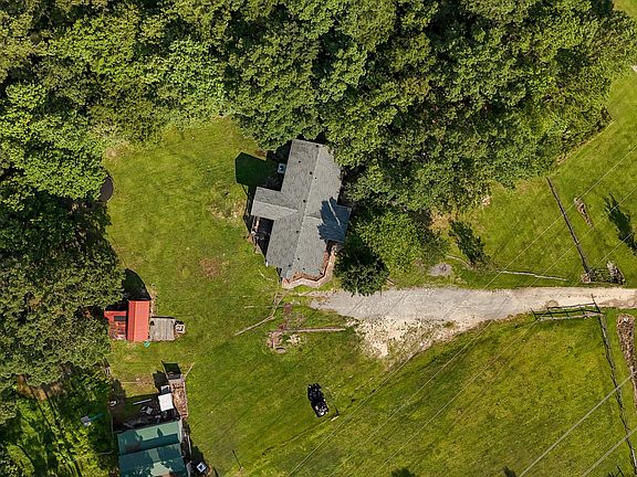 barn with 3 horse stalls, a goat shelter, chicken coop, tack room and hay storage area, there is water & electricity. Land is perfect for raising horses, cows,
