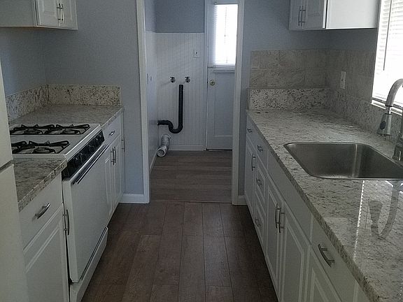 Downstairs 1 bedroom 1 bath unit. Laminate floors, granite kitchen counters, gas range, built in microwave and refrigerator provided. Tile bathroom shower, Indoor laundry room fits stack washer and dryer (not included). Water, sewer, exterior pest control and landscape maintenance included in rent.