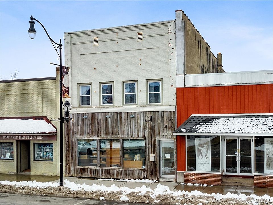 Truly a one-of-a-kind opportunity to own this incredible business AND residential space in one. The back portion comprises a modern-industrial style apartment giving you a City-Living feel with impressive, two-story high ceilings, exposed brick work, HEATED bathroom floor, and an open-floor plan. You'll love the updated kitchen with large center island & stainless steel ENERGY STAR appliances overlooking a gas fireplace in the living room area. Truly no maintenance living. A big city feel yet set in small town, situated right on the town's Primary road, less than a mile from the Thru-Way, a central location right off Route-5 between larger cities of Syracuse and Rome. The front portion of the building offers a light and bright business storefront space with big front windows set right on the town's sidewalks. Would make the perfect home to many different types of businesses. There's a large open loft style space upstairs with tall ceilings, hardwood floors, and big windows bringing in beautiful natural light - would make for a wonderful Yoga studio, office space, gym, room for private parties or events, and so on. THREE separate spaces all in one and each will absolutely WOW you.