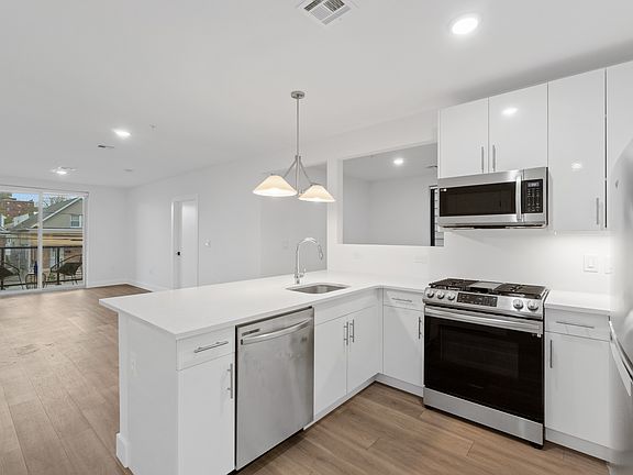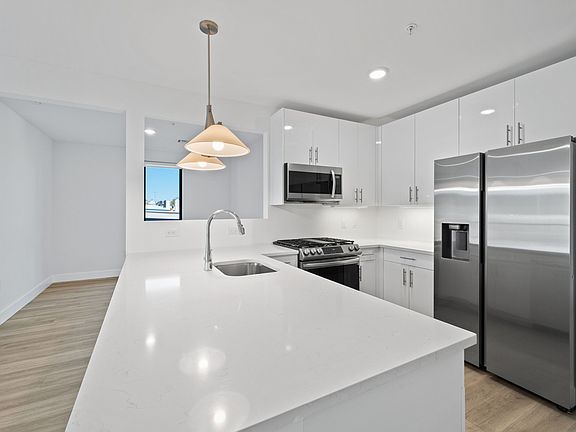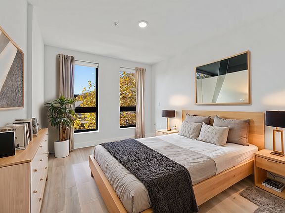 Prepare to be amazed by this gorgeous rental in a boutique elevator condo building in Bayonne! This 1200 sqft unit is bright and spacious with an open floor plan featuring 2 Bedrooms 2 bath + Den space, flooded with natural light throughout. The expansive kitchen is a chef's dream, featuring stainless steel Samsung appliances, modern custom white gloss cabinets, and stunning statuario Quartz countertop island. Perfect for all your culinary creations and to entertain! Relax away in the primary bedroom, complete with a custom walk-in closet and an en-suite bathroom featuring designer porcelain tile, Kohler fixtures, double-sink sleek vanity and glass standing shower. For your convenience, this unit also includes an in-unit full size washer and dryer. Enjoy your private balcony with bridge & water views and one car assigned garage parking space. Located just one block away from waterfront park and near major transportation, restaurants. This unique condo offers the best of both comfort and convenience with a virtual doorman system, residence lounge, package room and rooftop. Don't miss the opportunity to make this beautiful space your own! Onsite storage units available.