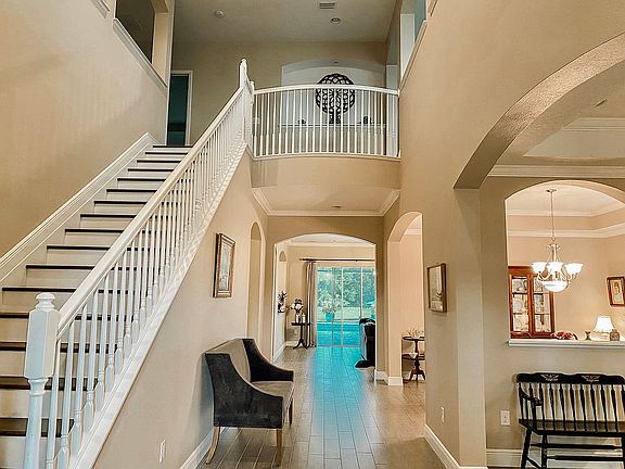 This magnificent custom estate is situated on the most incredible double pond view lot in Rye Wilderness! Spanish style architecture and a charming front porch with arches sets the stage for this spacious 2-story home. Enter to a dramatic staircase with Juliet balcony and sight-lines through to the pool & preserve views. The formal living and dining rooms are spacious & elegant and feature plantation shutters and a double-arched pass-through for entertaining. The first floor has beautiful easy-care wood-look tile plank flooring throughout, and the high ceilings allow for lots of light. The Kitchen is well-equipped with top of the line GE stainless steel appliances, granite counters, double ovens and more gleaming white cabinets than you could ever need! The design includes both an island and an eat-in dinette area with bill-paying desk AND a butler's pantry just off the family room! Double-arches pass through to the family room and lead to the wall of sliding doors that access the gorgeous pool and lanai. The first of the five bedrooms is an en-suite downstairs, making this a multi-generational home. The additional four bedrooms and a bonus room are upstairs, all with wood flooring. The owner's retreat is a relaxing haven: the spacious bedroom features a tray ceiling, a spa bath with relaxing soaker tub and walk-in shower, and the most beautiful view from the upstairs balcony overlooking the pool, two ponds, and preserve. This special feature is exclusive to this home, as it is no longer available from the builder! Outside, the pavered lanai is massive, with room for multiple seating areas that overlook the inviting heated saltwater pool & spa with sun shelf and water features! The double pond and preserve views are spectacular and the spacious lot is lushly landscaped with tropical foliage. The home also features a 3-car side-entry garage, double paned windows with plantation shutters, and is in a fantastic location with easy access to Tampa, St. Pete, Lakewood Ranch & Sarasota. Rye Wilderness is known for its generous lot sizes, proximity to great schools, quality-built homes, and offers amenities such as sports courts and a playground. It's only a short drive to great shopping, dining, entertainment, and fabulous Gulf Beaches!