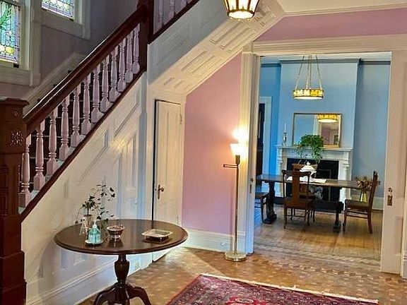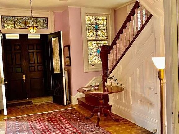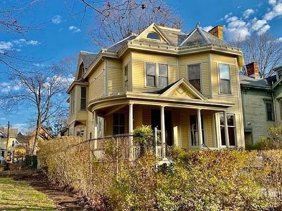 Artist's romantic 1893 Queen Ann Victorian home shows off the delightful architecture of the era, both grand and fanciful. The cathedral ceilinged foyer opens to a sweeping staircase wall lined with stained glass windows; French Doors lead to a light filled double parlor with bay windows and a pristine fireplace. From the rear of the foyer is the formal dining room featuring a wall of tall bay windows with window seat. A vintage hanging lighting fixture reflects over the formal fireplace. The large eat in kitchen is well equipped with recent appliances and extra service sink for casual entertaining with space for a large table. A broad covered porch overlooks a deep rear property. The second floor oversized Master Bedroom sitting room with decorative fireplace is framed by tall windows. Three other bedrooms, two bathrooms terminate in a four season porch in the Victorian style. Third floor two bedrooms provide privacy sinks and a shared separate toilet room. A vaulted unfinished space inspires a dreamer's fancy, has access to the widow's walk on the roof. The home's decor is lighthearted and charming. Located in the Academy Garfield Historic District and is convenient to the burgeoning restoration of Poughkeepsie's cultural, entertainment life, River Front development, Walkway over the Hudson, Empire bikeway and Historic Metro North railroad station ninety minutes from Manhattan.