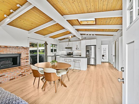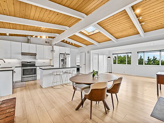 This stunning top floor unit is light filled and has stunning views of the bay and bridge, and the most incredible views of the sunset. Featuring two bedrooms and one bathroom, a large living room and dining area, and fantastic kitchen, it is a wonderful place to call home. The living space is stylish with vaulted ceilings and a beautiful floors. The kitchen features stainless steel appliances and quartz counters, even a small wine refrigerator! Outside there is a private patio large enough for table and chairs. The unit comes with a one car covered parking spot and a storage shed. There is common area outdoor space available as well. This location is ideal for commuting north or south as it is a short distance to the 101 freeway; it is also close to downtown San Rafael and all it has to offer. *Downstairs unit #113 is occupied, please do not disturb.