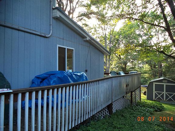 Short walk to Lake Wallenpaupack from this lake rights home in Sunset Village. Beautiful, newer modern kitchen with granite counters & hardwood floor & a lovely flower box window over the sink. Large living room and deck for entertaining. 3 bedrooms and den as 4th bedroom - with newer luxury bathroom & whirlpool tub. Central air and large garage too. Nice yard and shed. Come and see this home today!