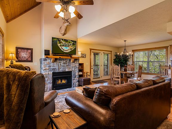 Lodge style duplex cabin 1-bedroom 1.5 bath tucked in the woods overlooking Forest Lake at Stonebridge Village near Table Rock Lake and Branson. You will fall in love with the rustic character of this unit featuring vaulted ceiling, hardwood flooring, fireplace and screen porch. Plus, all the amenities offered in Stonebridge Village make this an amazing resort like get-a-way place. You can play golf on LedgeStone Championship Golf Course, throw a fishing line in the catch and release Forest Lake or venture a short distance out of Stonebridge Village to Silver Dollar City and Table Rock Lake. Fully furnished and ready for use as a nightly rental investment property or as your own escape place. This cabin features an upstairs master suite complete with private bath with whirlpool tub plus separate shower. Come on over to ''Country Bear Cabin'' to relax and unwind from the cares of the world.