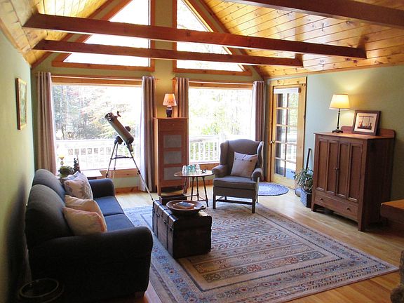 PRIVACY! Cross the stream and meander along the scenic driveway to your own private haven. A massive wood burning stone fireplace is the central focal point of this warm and inviting custom built home being offered by the original owners. An awesome living room with wood floors, shiplap pine cathedral ceiling, exposed beams and wall of windows. The spacious kitchen boasts great cabinet/counter space, newer appliances, breakfast bar and window seat. Formal dining with stone wall accent and french doors. The primary bedroom features a shiny new bath and french doors to the wrap around deck. A den and 2nd bedroom round out the main floor. Solid wood doors and natural woodwork. The walk out lower level provides additional living space to include a family room with woodstove, 3rd bedroom, office and 3/4 bath. Economical combo wood/oil furnace. Relax/dine/BBQ on the wonderful covered porch or soak in the sun on the stone patio overlooking wooded privacy and gardens. A circular drive brings you to the oversized 2 story 2 car garage with second floor workshop and bump out for equipment storage. Property could easily work for animals/livestock. And did I mention PRIVACY! Lovely grounds with stone wall accents, open lawn and fire pit. New roof shingles. Convenient rural, but not isolated, commuting location just 2 miles from the Mass border and easy access to the I91 corridor.