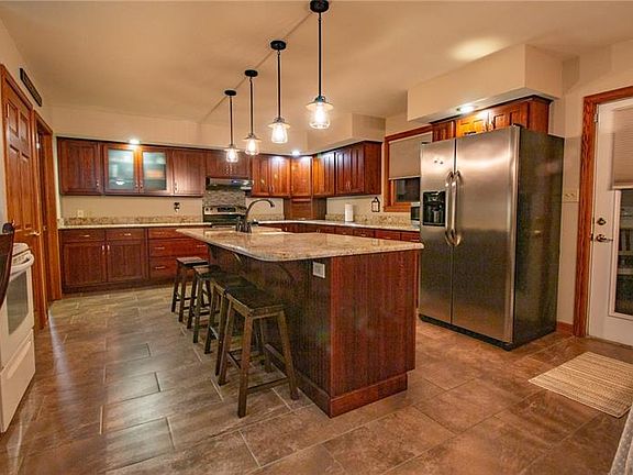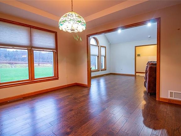 Come View This Slippery Rock Twp Opportunity - 4 Bed 3 Bath brick ranch 3 Car Garage on 5 acres with 78x60 4 stall building . Main Level has large eat in kitchen with granite countertops, Amish cherry cabinets, farm sink, stainless steel appliances and large island. Living room with vaulted ceiling, dining room with tray ceiling, master bedroom with tray ceiling, full bathroom with walk-in tub and sky light and 2 additional bedrooms. Lower level is fully finished and has a large family area and 2 additional bedrooms w/ walk-in closets, full bath, den and utility area. Covered back deck off the kitchen leads to a fenced in above ground pool, deck and a campfire ring surrounded by decorative stone. The 4 stall garage/building is heated, fits 50 ft vehicle and 50 amp outlet. Solar panels on building supplies the entire property and receives refund from the electric company depending on usage. Geothermal heat and wheelchair friendly home.