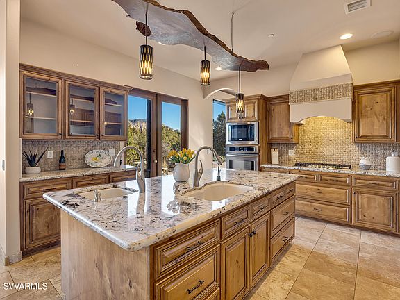 Spectacular 20-ft High Atrium and Winding Staircase invite you in to enjoy luxurious and comfortable living. Travertine tile floors in foyer and kitchen, Gorgeous Rustic Alder doors and custom cabinetry throughout. Entertain friends and family in ultimate style and comfort in the many fabulous interior and exterior spaces. Prepare your favorite culinary creations in the SPACIOUS gourmet Kitchen including granite Island w/prep sink AND large walk-in pantry and chef's recipe desk. Dining room off kitchen. Easy access to enjoy the ZEN-LIKE private backyard with covered porch, paver patio, exquisite high-desert landscaping, BBQ station and impressive cascading water feature adorned with indigenous rocks and plants. Irrigation equipped with EZ-Flo Fertilization System for the plants! No pesticides or herbicides used during past three years in backyard gardens. Adjacent parcel is owned by County and will never be developed.