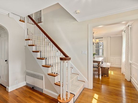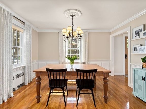 "House Beautiful" depicts this meticulously and tastefully renovated seven room Center Entrance Colonial, featuring a sun-filled living room with wood-burning fireplace, custom built-ins and window seat.The charming formal dining room adjacent to a beautifully renovated gourmet kitchen highlighted by Carrara marble counters and S/S appliances. A bright sunroom with hardwood floors and sliders opens to the back yard, half bath and custom mudroom complete the 1st level. The 2nd level is highlighted with custom finishes and 4 generous bedrooms including an En-suite master bedroom, 2.5 designer baths, walk up attic offers expansion potential. The lower level has a finished room with fireplace ideal for a family room, exercise room or office, storage and laundry. The exterior offers thoughtfully designed landscaped grounds including, a brick patio and wall, new walk, irrigation system and one car garage. Proximity to schools, public transportation, Cambridge and Boston enhance this home.