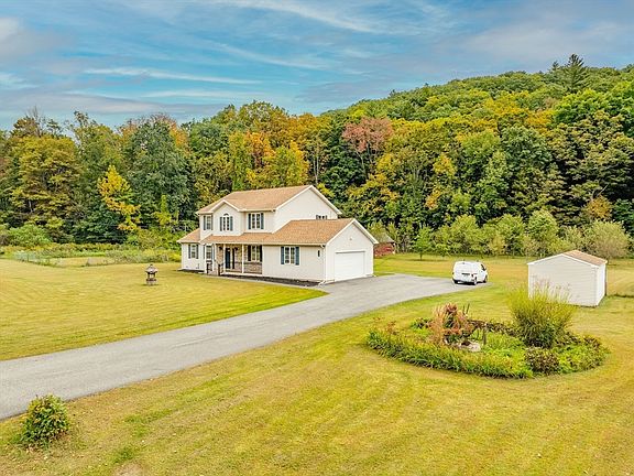 Beautiful 4 Bedroom, 3.5 Bath Colonial on 2.44 Acres! This home offers a first-floor primary suite with a luxurious en suite bath featuring a Jacuzzi tub and shower stall. Upstairs, find a guest suite with its own full bath. The home boasts hardwood floors throughout and abundant closet space.The open kitchen features granite counters, a 4-seat island, and flows into the formal dining room. Enjoy the cozy living room with a wood-burning stove and coffered ceiling. The insulated basement includes two finished rooms—perfect for an office and playroom. Outside, relax on the covered deck, overlooking the large yard with apple and pear trees, grape vines, and blueberry bushes.Recent upgrades include a Mitsubishi heat pump/central A/C system and a whole house generator panel. The home is plumbed for radiant heat flooring, but is not connected. There's also a 12x24 outbuilding with electricity for added storage or workspace. A must-see property!