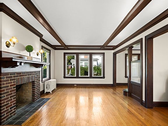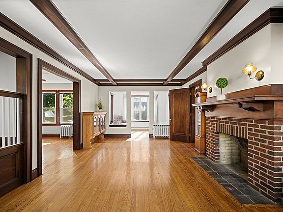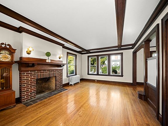 Brick fireplaceVinyl replacement windowsNewer roofTwo car garageGleaming hardwood floorsVintage glass knobsStainless steel appliances
