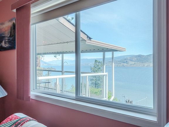 With only the KVR trail between you and the lake this charming rancher-style w/basement home offers breathtaking lake, mountain and city views. The tranquil lakeside setting and open layout is designed for comfortable living. A spacious solarium spans the front of the living area and provides panoramic views, creating an inviting space to relax. With its standalone fireplace it transforms into an all-season room perfect for savouring a glass of wine or enjoying your morning coffee while soaking in the serene ambiance of the lake. There is the large sundeck accessible from the living room and primary bedroom and an observation deck- both offer ideal spots for outdoor entertaining or enjoying the view. Warm maple hardwood floors and pine ceilings create a cozy, inviting atmosphere. The European custom kitchen features a pantry, appliance garage, ceramic backsplash, cabinet lighting, and a charming garden window. The full daylight basement presents endless possibilities- with two additional bedrooms, laundry facilities, and ample storage space. plus the living room and 2nd kitchen have potential as an in-law suite, bed & breakfast or a just a great space to entertain company. An attached garage/workshop has 220V power. Private fenced yard has irrigation, a garden area, a fiberoptic greenhouse and an array of fruit trees. This property offers the perfect blend of comfort and natural beauty. Schedule a viewing today and immerse yourself in the serenity of lakeside living.