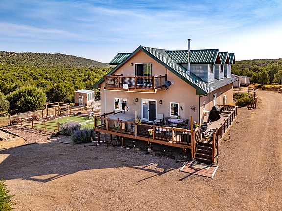 Escape to your own slice of Southern Colorado paradise with this impressive custom-built home that's designed for both comfort and adventure. Finished in 2019 this red iron steel-structured house sits on a sprawling 35+ acre lot with million-dollar mountain views. Step inside to discover an open-concept living space featuring a gourmet kitchen that would make any chef jealous. The space boasts slow-close cabinet drawers, double convection ovens, a farmhouse sink, and custom granite countertops with a convenient breakfast bar. Radiant in-floor heating powered by a Bosch boiler system keeps you cozy year-round, while Pella windows flood the home with natural light. The upper level houses two generous primary bedrooms sharing a luxurious Jack and Jill bathroom. Down below, the basement provides excellent additional living or storage space, perfect for hobbies or entertaining. Outside is where this property truly shines. Multiple decks offer various spots to relax and take in those stunning views. The outdoor amenities include a hot tub for starlit soaks, a barbecue patio with horseshoe pit, a small greenhouse and garden. Two full-service RV hookups accommodate guests, while the round corral and various sheds serve practical needs. The attached two-car heated garage plus an additional detached oversized garage provide ample storage. Despite feeling wonderfully secluded, you're just ten minutes from town via well-maintained roads. With its quality construction, thoughtful amenities, and prime location, this property offers the perfect blend of luxury and rural living.