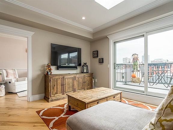 Simply stunning! This one-of-a-kind 3 bedroom/ 2 bathroom Downtown Hoboken penthouse condo has it all. From the moment you step off the elevator directly into your apartment, you are surrounded by luxury. This home features a fully equipped top-of-the-line kitchen complete with Viking appliances, bamboo cabinetry, and granite counters with a breakfast bar. The living/dining room features high coffered ceilings, a skylight, custom moldings, recessed lighting and over-sized floor-to-ceiling sliders leading to a private terrace with Freedom Tower views perfect for summer BBQ's and morning coffee. Master suite is complete with large custom closets and en-suite master bath finished in granite, with a dual vanity and frameless glass steam shower. Two guest bedrooms, both generous in size, offer high ceilings, large windows, detailed ceiling moldings and an abundance of closet storage with California Closet systems. Large guest bath is handsomely finished with marble tiling, an over-sized vanity and soaking tub. Additional features include central A/C, in-unit washer/dyer, wide plank hardwood flooring throughout and custom lighting. Located in a prime Downtown Hoboken location, you'll find easy access to shopping, dining, the Hoboken waterfront, NJ Transit bus and Hoboken PATH.