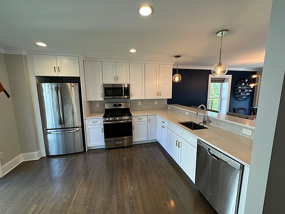 Step inside to an open-concept main level, ideal for entertaining. The bright and airy living and dining area flows seamlessly into the spacious kitchen, complete with white shaker cabinetry, quartz countertops, stainless steel appliances, pantry, and a large peninsula with seating for four or more. Oversized windows flood the home with natural light, complemented by hardwood floors and 9-foot ceilings throughout.