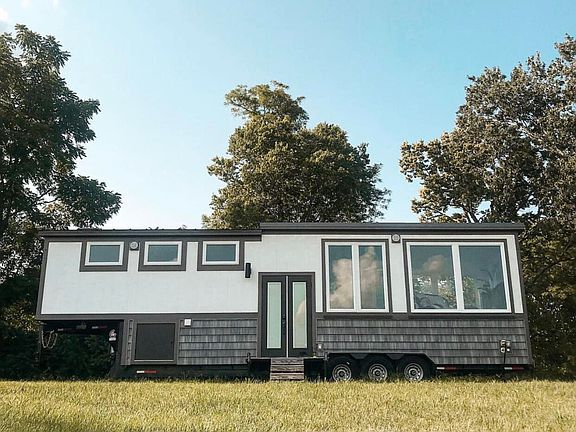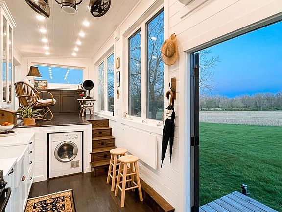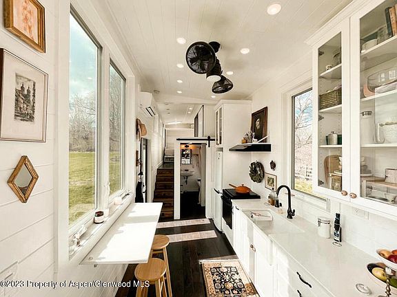 Luxurious off-grid capable 330 sq ft mobile tiny home! This 1 bed, 1 bath gem (40' X 8.5' X 14.5') features high ceilings, glass cabinets, and abundant natural light. Enjoy a gas range, quartz countertops, farmhouse sink, barn door, and clawfoot tub. The bedroom is an 8.5'X8′ open space with a lofted queen bed. Ideal primary living space or vacation rental. Solar-powered with RVIA and NOAH certified RV hookups. Colorado-winter ready with double honeycomb window treatments and insulated skirting. Extras: washer/dryer combo, wall-mounted HVAC, gyro ceiling fan, storage drawers, and an 8.5'X6' exterior-accessible storage space.