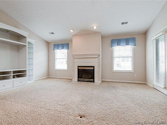 Well maintained home close to stores, restaurants, doctors, hospital, I-265 just minutes to Louisville. 1758 sq ft  two spacious bedroom brick condo with enclosed sunroom with heat and air, gas fireplace, built-in entertainment center & two car garage in beautiful Kingsfield. Inviting open floor plan, tiled entry, 11'6" cathedral ceiling in great room open to fully equipped kitchen with large breakfast bar, new kitchen sink 2023, microwave 2022 and refrigerator 2023. Main bedroom has a wing of it's own & includes spacious walk-in closet, garden tub, separate shower, double vanity & tile floors. HOA fee of $160/monthly includes lawn maintenance, snow removal for 4"+, exterior insurance & maintenance and is paid through the end of 2023 for new buyer. New roof approx. 2019, New HVAC 2020. meticulously maintained. See attached documents for HOA rules. Buyer must be owner occupant per HOA restrictions.  Sq ft & rm sz approx.  HOME SOLD AS IS!