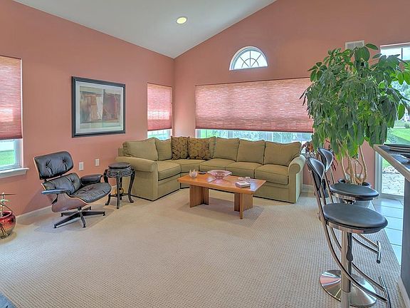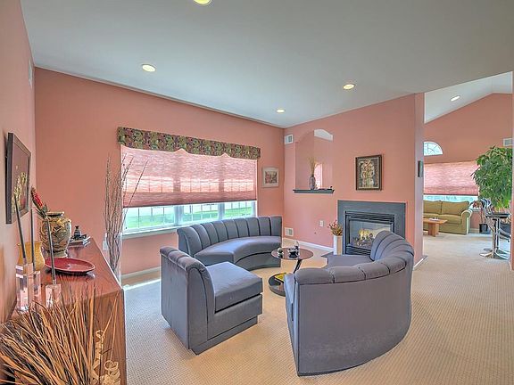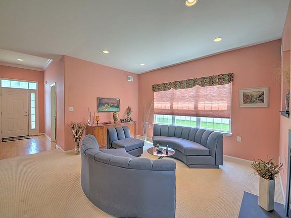 Beautifully appointed Wellington Model in Adult Community. Double sided fireplace in LR and Family Rm. Perfect for single level living,NO MORE STEPS. Vaulted ceilings in Family Rm. and Kitchen. Hunter Douglas window treatments all stay. Recessed lighting throughout. Large entry w hardwood floor and decorative molding. Serenity is what comes to mind while sitting on backyard paver patio with waterfall and beautiful landscaping. Home is on the end of Cul de sac lots of peace and quiet.