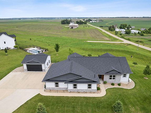 Step inside a home that is truly like no other! The acreage sits atop a hill with breathtaking views of the Iowa countryside. Every detail of this property has been meticulously updated by its owner. Outside, each tree has individual lighting to showcase the properties beauty at night. The 1300 sq.ft. attached 5-car garage is heated and cooled and has its own bathroom. Plus, an oversized 2-stall shop with heating, and a mower garage under the deck. Enjoy the views from the composite deck or the inviting 4-seasons room. Inside has over 15-foot vaulted ceilings, with a large and open kitchen and Tigerwood flooring throughout the main level. The dreamy master suite beckons with its luxurious amenities. The lower level has a finished bar/rec room and two additional bedrooms. With a state-of-the-art security system, whole-house generator, and more, this home stands out as a must-see gem in today's market.