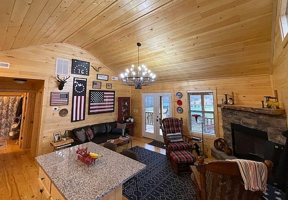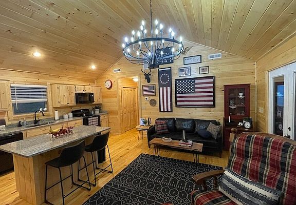 BRAND NEW log sided cabin in the mountains of Western NC. This one bedroom, one bath home, is completely furnished, beautifully decorated and comes with an equipped kitchen and bath, just waiting for you to make yourself at home. You will also be very comfortable on your inviting covered porch as you enjoy the lovely meadow and mountain views, from your swing, rocker or adorable sitting area. This cabin feels like home as soon as you walk through the door, with it's cozy all wood interior, and beautiful natural lighting. Keep warm by the corner gas log fireplace on cool nights. The kitchen boasts solid wood cabinets, granite countertops, an island, all new appliances and a pantry. Wood flooring throughout the cabin. Full laundry facilities.