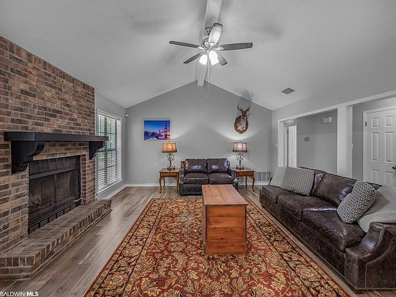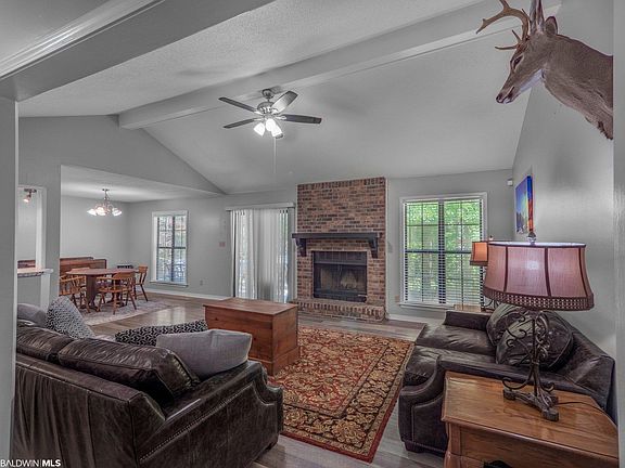 Great Location in the heart of Daphne. Easy access to I-10 and all things shopping. Great room has vinyl flooring, brick fireplace, vaulted ceiling and ceiling fan with sliding backdoor to the deck. Kitchen has tile floor with plenty of counter top space, island, panty, eat in breakfast area and a bar overlooking the great room. Separate dining area beside the great room. Down the hall are 2 bedrooms with carpet and a full bathroom to share. The primary bedroom has carpet with tub/ shower combo. Laundry room has 2 cabinets. 2 car garage. Neighborhood amenities has 3 swimming pools, tennis courts, golf and frisbee golf. Owners just installed 6" seamless gutters with Leaf Filter installed on top of gutters to keep debris out. Gutters have a lifetime warranty with a no clog guarantee that will transfer to the new owners. New roof and AC in 2018. Have you viewed this home yet? Come see this great home!
