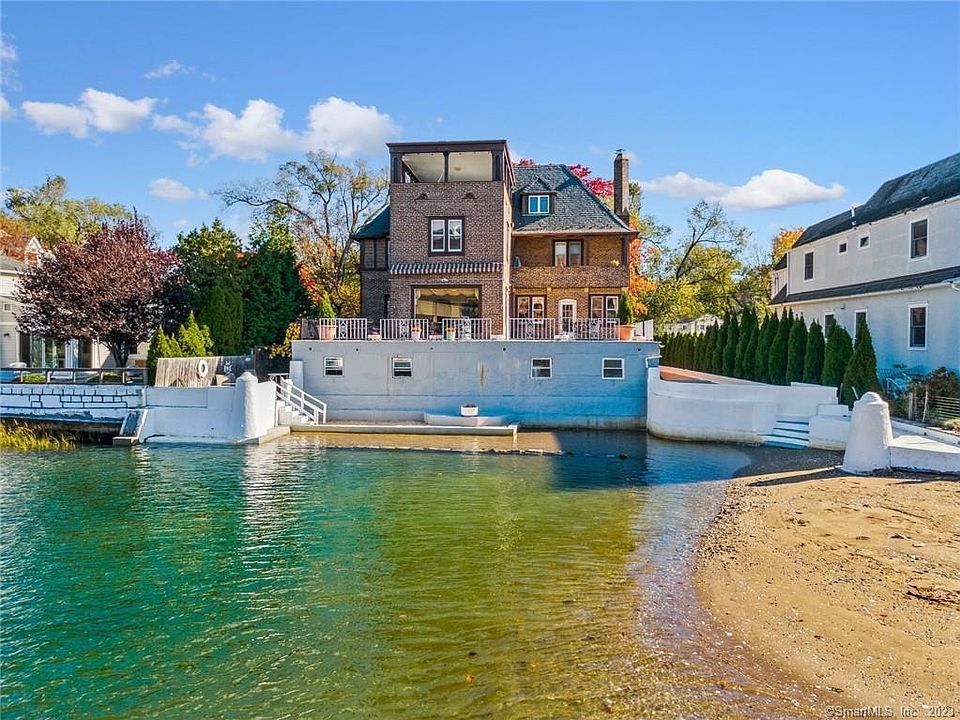 Lowest waterfront home in Stamford Immaculate waterfront brick colonial with incredible views. Inviting foyer opens to the charming, spacious living room with a fireplace. The grand formal dining room is great for family gatherings or entertaining. Eat-in kitchen with both a breakfast bar and a breakfast nook. The cozy den has walls of glass and door to beautiful waterfront wrap around patio/terrace. There is another waterfront patio as well as two other waterfront balconies. The master suite has a full bath with a whirlpool and waterfront balcony. There are 3 other very spacious bedrooms and a full bath. The third floor has another suite complete with a sitting room, kitchenette, bath and bedroom with beautiful water views. There is a large waterfront terrace with expansive views of the Long Island Sound. There is an in-law in the lower level with it's own entrance and waterfront patio. The full basement has great storage. There is a large carport and large space that could be turned back into a garage. There is a dock that has been out of the water for some years so would need approval from the city. This charming waterfront home is great for entertaining or comfortable family living. A fabulous location being 5 minutes to downtown Stamford, I95 and the Stamford train station.