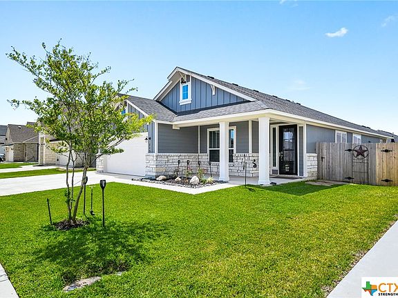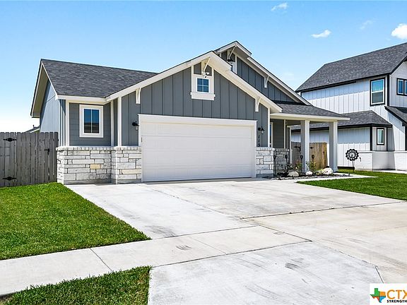The beautiful and timeless "Wimberly" Texas Farmhouse, upgrades include extended driveway, 9ft glass front door, upgraded toilets, extended back patio. This open concept, split bedroom plan features a large living room, gorgeous kitchen with a large quartz island, farmhouse sink, upgraded appliances and custom built wood cabinetry. Primary suite features gorgeous sliding barn doors for added charm, large Euro walk-in shower, dual vanity and over-sized closet. This home also includes an over-sized 2 car garage allowing for future homeowner to utilize the 5 foot garage extension for a heavy duty work station or storage also there is a washer connection in the garage.