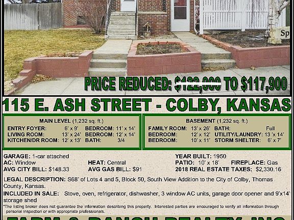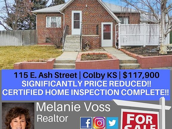 Significantly Price Reduced! 115 E. Ash, Colby KS. New Price of $117,900. Terrific brick home on a corner lot! 4 bedrooms, 2 baths, full basement, plentiful storage and built-ins, gas fireplace, bright organized kitchen, attached garage, fenced backyard, private patio and grilling area, underground sprinklers, and more!