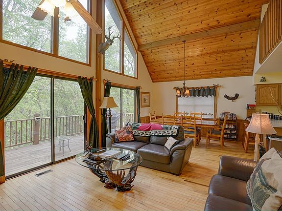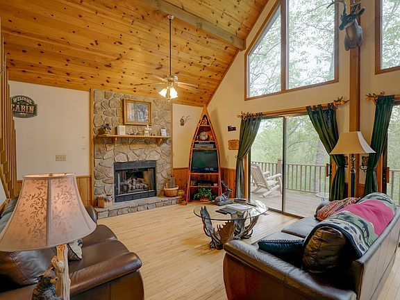 Charming 2 bedroom, 3 full bath cabin located minutes from Lake Fontana Boat Ramp. View of Lake Fontana through trees from hot tub on one of two decks! Open floor plan with knotty pine tongue & groove vaulted ceiling & wainscoting. Floor to ceiling stone gas log fireplace & oak hardwood floors in main living areas. Large bedroom & full bath on main. Lofted master bedroom with full private bath. Lofted bedroom has same knotty pine vaulted ceiling and a picture window. Lower level daylight living area/game room boasts gas stove, tongue & groove wainscoting and ceiling plus two sliding doors to covered deck with hot tub! Settle in for a movie or play a game of foosball. Another all wood full bath with decorator vessel sink. Outside access. Two deck levels with lake views through the trees: one covered deck off lower level with hot tub & upper level deck off dining area for grilling & evening drinks. Head out to the front yard & roast marshmallows over the large firepit. Washer/Dryer conveniently located off finished basement area with storage. GREAT vacation rental or family getaway. 15 minutes from GSMP hiking, Deep Creek tubing, Nantahala River kayaking, Fontana Lake boating nearby!