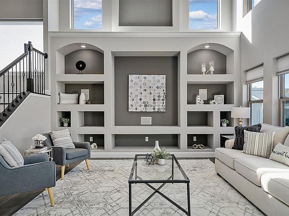 - Bookcases, High Ceilings, Coffered Ceiling(s), Open Floorplan, Walk-In Closet(s), Separate Dining, Double Vanity, Tub, Breakfast Bar, Kitchen Island, Eat-in Kitchen, Granite Counters, Walk-In Pantry, Sound System, High Speed Internet, Two Story Entrance Foyer