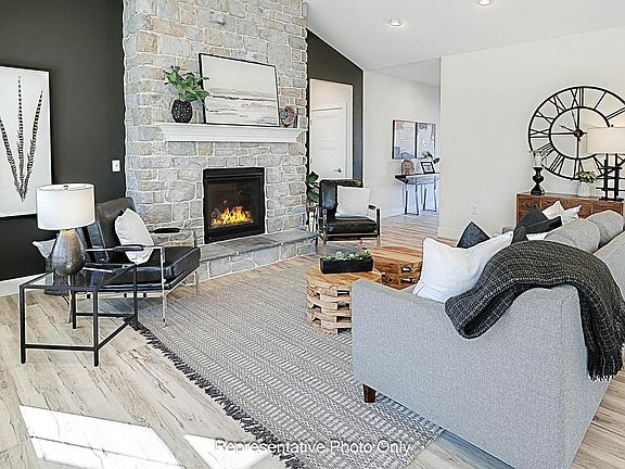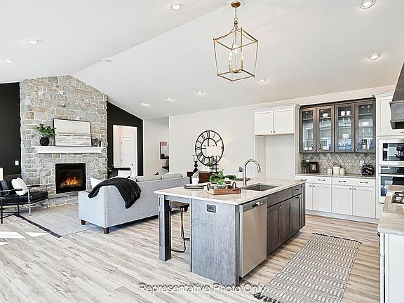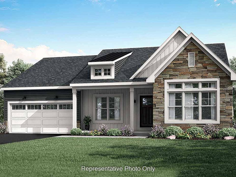 UNDER CONSTRUCTION: This charming, 1-story home in our Winding Creek 55+ community features a welcoming front porch and a 2-car garage with mudroom entry. Stylish vinyl plank flooring flows throughout the main living areas. At the front of the home are 2 bedrooms and a full bathroom. The great room, warmed by a gas fireplace with full height surround, shares a cathedral ceiling with the kitchen. The kitchen is well-appointed with upgraded appliances, attractive cabinetry, and quartz countertops with tile backsplash. Sliding glass doors in the dining area provide plenty of natural light and access to the rear patio. Tucked quietly to the back of the home, the spacious owner’s suite includes a private bathroom with a tile shower and an expansive closet.